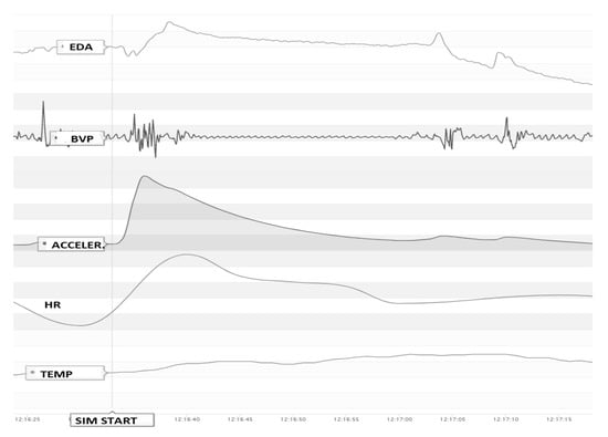 Biometric parameters when simulation starts. EDA—Electro-Dermal activity, BVP—Blood-Volume pulse, ACCELER—wrist acceleration, HR—Heart-Rate, TEMP—body temperature. In approximately 500 ms after the stimulants (start of the simulation), the biometrical parameters show significant response.
