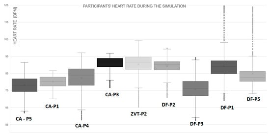 Observation of the HR rate (Figure 5) reveals a comparable participant’s HR pattern during the collision avoidance (CA) task, with a median 79.05 BPM, which we assume is a typical condition. With disturbance factor simulation (DF), the HR median rises to 84.65 BPM compare to the CA task. What is interesting is the appearance of the outliers. There are two explanations for them. First, we consider whether there is a sensor issue or some similar hardware problem. If the pattern repeats, we consider the second explanation, which is the participants’ characteristics. In the interview, participants confirmed that dangerous situations experienced on board in the past explained HR extremes (outliers) seen on the DF-P1 and DF-P5 (Figure 6). At zero visibility task (ZVT), the safety of navigation depends only on navigation instruments. We assume that the brain’s cognitive process will increase due to the saturation of the working memory. The median, in this case, rises to 92 BPM, which indicates a higher cognitive load due to the lack of visibility.