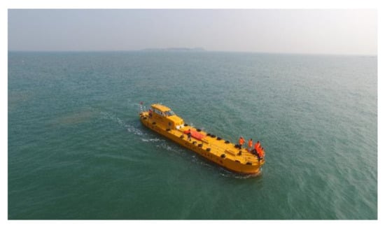 In this study, the real-time prediction of the ship model vertical acceleration was performed based on the self-propulsion test data obtained through a large-scale ship model comprehensive test system at sea []. The experiment was conducted in the sea area near Qingdao, China (35.9° N, 120.2° E). As shown in Figure 1, the glass fibre-reinforced plastic large-scale ship model was a single machine, single propeller, bulbous bow, square stern ore carrier type. The main parameters for this ship model are summarised in Table 1.