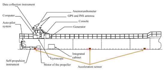 The overall layout of the related equipment on the large-scale ship model is shown in Figure 2. As demonstrated, the data acquisition system and control system were located in the cab; the propulsion system and auto-pilot system were installed in the aft cabin, and three vertical acceleration sensors were arranged in the bow, midship, and stern of the ship model (10% length between perpendiculars (Lpp), 50% Lpp, and 90% Lpp, respectively). The power of the self-propulsion ship model was provided by the propulsion system, including the generator, integrated cabinet, motor, and propeller. Through the console, Global Position System (GPS) and Inertial Navigation System (INS) antenna, and auto-pilot system, the ship speed and heading could be controlled. The self-propulsion instrument could obtain the thrust and torque of the propeller. In addition, the gyroscope could measure the roll and pitch angles of the ship model. The acceleration time history data (a1, a2, and a3) obtained by the sensors were stored in a computer through the dynamic signal data collector, which provided the original data for the real-time prediction of the ship model vertical acceleration. The sensitivity of the accelerometer was 0.40 mA/EU, and the accuracy of the accelerometer was 10−6 m/s2. The acquisition frequency of the data collector was 100 Hz. The frequency resolution corresponding to the fast Fourier transform (FFT) parameters was 0.0488 Hz. The FFT block length of the linear average spectrum analysis was 2000. The number of spectral lines was 800; the overlap rate was 0, and the acquisition mode was continuous recording. The inputs (a1, a2, and a3) were obtained under the same conditions, as shown in Table 2. For a detailed introduction of the self-propulsion test of a large-scale ship model at sea, please refer to reference [].