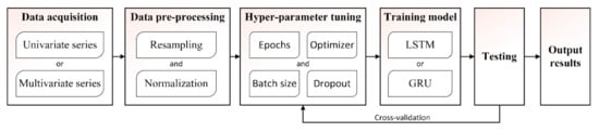 Two popular and efficient improved RNN models showing excellent performance are the LSTM and GRU models, which can learn and remember the characteristics of time series and avoid gradient divergence. In this study, the LSTM and GRU models were used as the basic neural networks of the real-time prediction algorithm of the large-scale ship model vertical acceleration to address the aforementioned problems. Figure 3 shows a flow chart explaining the process from data collection to the pre-processing and post-processing results.