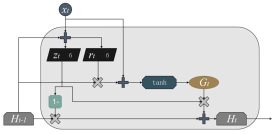 The GRU model can be regarded as a variant of the LSTM model, which simplifies the neural network structure and retains the effect of the LSTM model. It is suitable for situations with low hardware conditions or high time cost. The specific calculation formulas for the GRU model are as follows []: