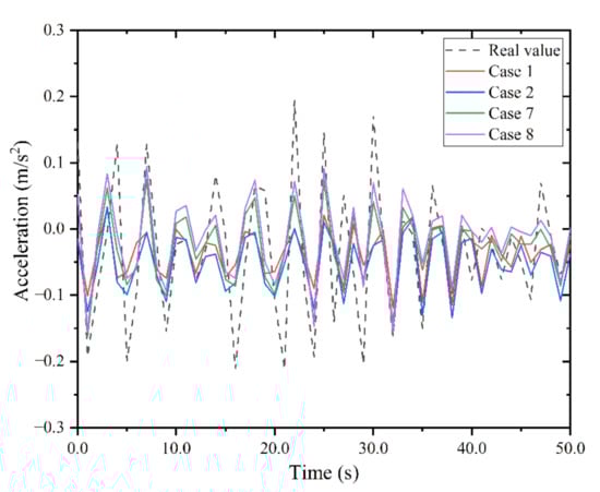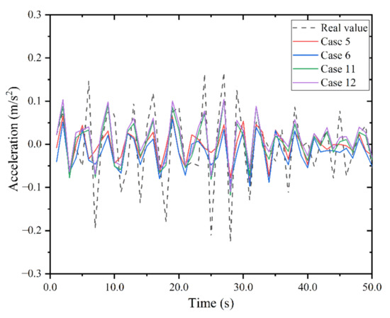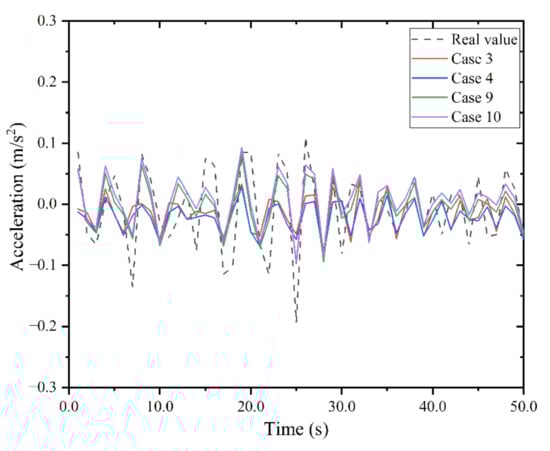 Three groups of pre-processed vertical acceleration time series of the large-scale ship model were used as the input datasets of the LSTM and GRU models. The first 60% of the time series data in each set were used for training, and the remaining 40% of the data were used for prediction. After testing and optimising the hyper-parameters of the neural network model, the numbers of hidden layer nodes and training epochs in this experiment were 50 and 500, respectively, and the batch size was 128. By using the Adam optimiser, the objective function to be minimised in the training process was the mean square error. A regularisation method commonly used in deep learning, called dropout, was used to deal with the prediction data to avoid the over-fitting phenomenon. In the process of neural network training, some of the hidden layer neurons were randomly removed; the fully connected network was sparse, and the complex co-adaptability between the neurons was reduced. Only the remaining neurons were used to build a new neural network, enhancing the robustness of the algorithm model []. However, the dropout method has a disadvantage in the sense that it will lead to decreased peak prediction accuracy. Owing to the pitching motion of the ship model at sea, the peak accelerations of the bow and stern of the ship model are certainly larger than those of the midship under the same working conditions, resulting in a large overshoot.