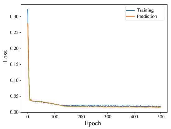Comparisons between the predicted and actual vertical acceleration time history data of the large-scale ship model are shown in Figure 6, Figure 7 and Figure 8. Combined with Table 4, the RMSEs of the LSTM and GRU models are observed to be approximately equal and lower than 0.1, which verifies the reliability of the neural network model and the algorithm implemented in this study. The overall trend of the acceleration data can be predicted accurately in each case, and the multivariate time series prediction algorithm can maintain a favourable prediction effect when the acceleration amplitude changes significantly. Because the predicted values of the acceleration time series of the bow, midship, and stern cannot accurately capture the actual high amplitude, the RMSE of its prediction program is higher than that obtained from the ship data. Although there are some differences in both the R2 values and the plots presented, the error mainly originates from the prediction of the peak value, and the prediction RMSE of the algorithm remains acceptable. Figure 9 considers case 8 as an example to show the loss curve of the neural network model training and prediction. The final loss is approximately 0.02. Moreover, no over-fitting occurs, which further verifies the accuracy of the prediction results.