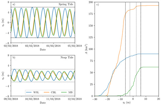 Design layout (Figure 1) and scheme characteristics (Table 1) are determined based on available information for the three tidal power plants. Embankment location for MB and WSL are derived directly from design schematics [32,35]. The ambiguous basin domain indicated for CBL [35] permits some design flexibility. Where information regarding hydraulic structure characteristics is unavailable, an assumption is made from similar power plant designs. For example, the turbine diameter for CBL is based on the diameter of the turbines of the TLP Swansea Bay lagoon design. Meanwhile, the number of sluices for MB and WSL are determined by a similar proportion between turbine and sluice numbers in CBL [37]. The basin area, tidal range and tidal phase () in Table 1 are calculated from outputs of the ambient flow conditions numerical model described in Section 3.1.