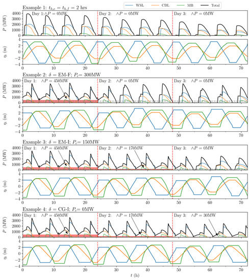 Power output P (MW) and basin elevations (m) of the tidal power plants. Example 1 indicates a scenario where the holding periods 2 h for each scheme. Examples 2–4 display BG-F optimised schedules, applying different examples of “default” , defined as the operation schedule reverted to when cut-off power (MW) cannot be achieved in the CG-F case. Daily minimum power (MW) determines the power sold on the Baseload Market (BM), indicated with red.