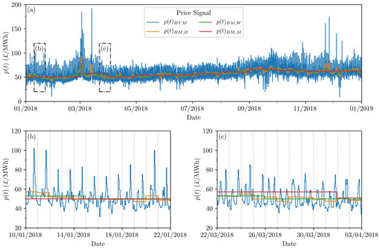 Hourly Variable and corresponding Baseload Market price signals (£/MWh). , , refer to daily, weekly and monthly averaging respectively. The displayed snapshots indicate (a) the entirety of 2018, and periods where (b) and (c) would be financially advantageous.