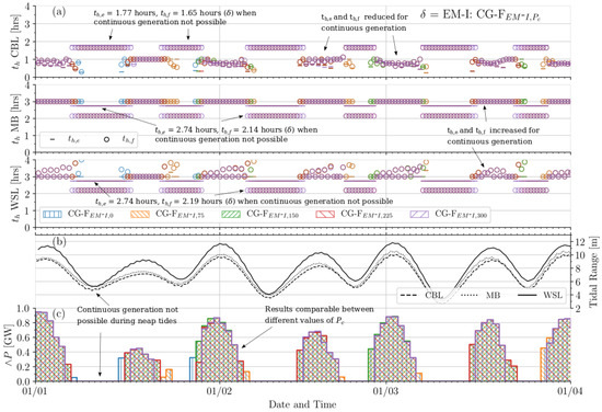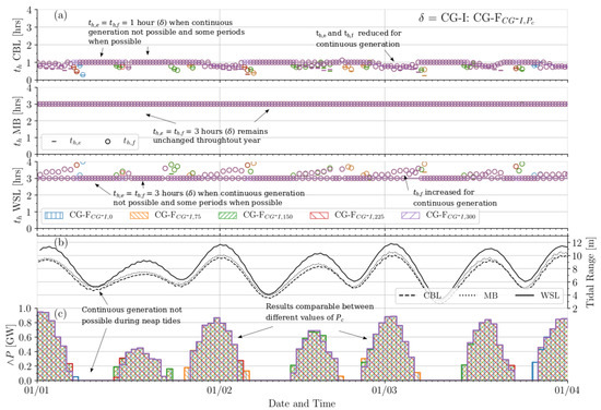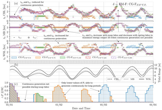 Figure 7, Figure 8 and Figure 9 provide time-series illustrating how the individual power plants alter their holding periods and at each cycle when applying the flexible continuous generation (CG-F) optimisation functions. In addition, the transient tidal range is indicated at each site in addition to the daily rate of the minimum cumulative power output . The indicated period is 1 January 2018 to 1 April 2018, with observed patterns present also for the remainder of the year. Certain observations are common to all three applied defaults () in CG-F. Days exhibiting > 0 MW are achieved in clusters during spring tides. The peaks of these clusters are roughly proportional to the magnitude of the tidal range. This supports findings presented in Table 3, where a higher average maximum power output is achieved exclusively on CG Days compared tp all days , despite the former not being optimised to maximise energy output. This is due to the higher maximum power availability during spring tides, where the increased degree of flexibility also permits continuous generation. Furthermore, Figure 7, Figure 8 and Figure 9 indicate the required control periods in generating continuously, where possible. For the Mersey Tidal Barrage (MB) and West Somerset Tidal Lagoon (WSL), and values in are pushed towards the upper limit of = 4 h (flood periods in particular for WSL), while the Colwyn Bay Tidal Lagoon (CBL) gradates (ebb periods in particular) towards the lower limit = 0 h.