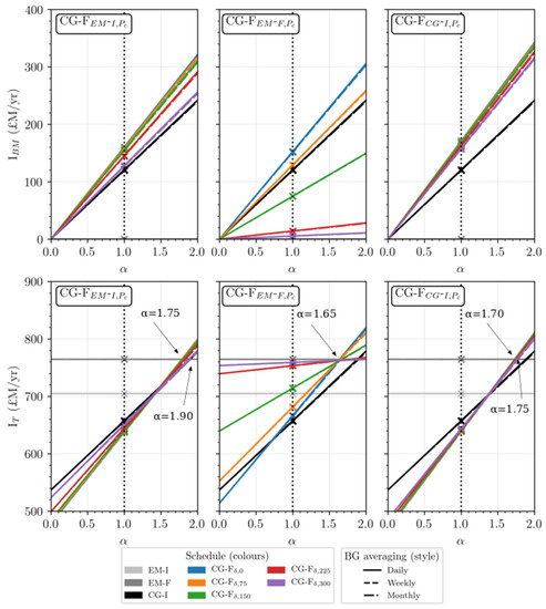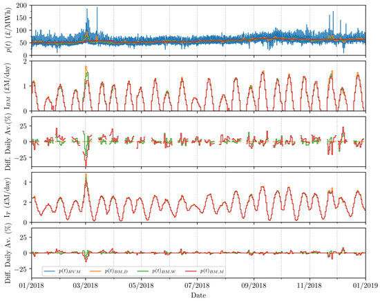 Figure 11 indicates the minimal difference in annual Baseload Market (BM) income I and total income I between daily , weekly and monthly BM price signals. However, understanding the provenance of these differences could be useful in predicting the effect on I and I in processing future Hourly Variable Market (HVM) price signal exhibiting a different structure. Figure 11 shows daily sums of I and I when applying the corresponding averaged cases. It can be seen that, on days where > 0 MW (i.e., I > 0 £/MWh), there is little disparity in I and I among averaging cases. The percentage difference between the daily baseload average case and the weekly and monthly averages is consistently less than 10% for I, and often less than 5% in I. The weekly and monthly averages are less susceptible to dips in hourly variable electricity price, but also less able to take advantage of large spikes in price, as experienced in March 2018. Indeed, while a sudden spike may be advantageous to the day in question on the daily averaging market, its price benefits on the weekly and monthly markets are more spread out. In the event of baseload market scaling (the application of > 1), these effects would be amplified.
