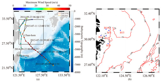 Two typhoons, Fung-wong and Chan-hom, which passed over the Zhoushan Islands from 17 to 25 September 2014 and 29 June to 12 July 2015, respectively, were selected. The data for the two cyclones were collected from the Tokyo-Typhoon Center of the Japan Meteorological Agency (JMA). The tracks of the two typhoons overlaid on the water-depth map are presented in Figure 1a, in which the black square encloses the waters around the Zhoushan Islands. It can be seen in Figure 1b that the water depth ranges from kilometers in the East China Seas to tens of meters at the coastal shorelines. In particular, there is a series of islands at the mouth of Hangzhou Bay, indicating that the buoys located between Hangzhou Bay and the island chain provide valuable data, since the strong tidal currents, typhoon-induced currents, and changes in sea-water levels all occur in this area. This confluence of factors provides us with the opportunity to investigate the effects of typhoon-induced current terms and storm water terms on wave simulation for typhoons.