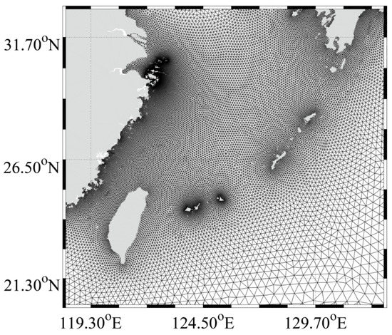 It is well known that storm water inundation is an important factor for assessing marine-hazard risks under extreme weather conditions [37] and also impacts wave simulation for coastal waters through various effects, e.g., wave-induced radiation stress, current–wave energy exchange, and bottom stress. Therefore, the sea-surface current and sea-water level were simulated with the FVCOM for the same region as the SWAN model, in which the H-E wind was the forcing field. The tide data from the TPXO.5 model, as well as the sea-surface temperature, sea-surface salinity, and sea-surface current values derived at 60-minute intervals at a 1/12° (~8 km) grid spatial resolution from the HYbrid Coordinate Ocean Model (HYCOM) were used for the open-boundary condition. The unstructured grids are illustrated in Figure 2 and are uniquely used in the SWAN and FVCOM simulations. It should be noted that the simulated currents lasted from 1 July to 1 October 2014 and from 1 May to 1 August 2015, to ensure the stability of the FVCOM [38]. The basic governing equations of the SWAN and FVCOM simulations are described in Appendix A and Appendix B, respectively. The details concerning the model settings for the FVCOM and SWAN are briefly presented in Table 1 and Table 2, respectively.