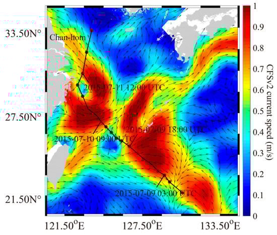 Sea-surface-current vector map from the Climate Forecast System Version 2 (CFSv2) model at 06:00 UTC on 11 July 2015, in which the black line is the track of Typhoon Chan-hom.