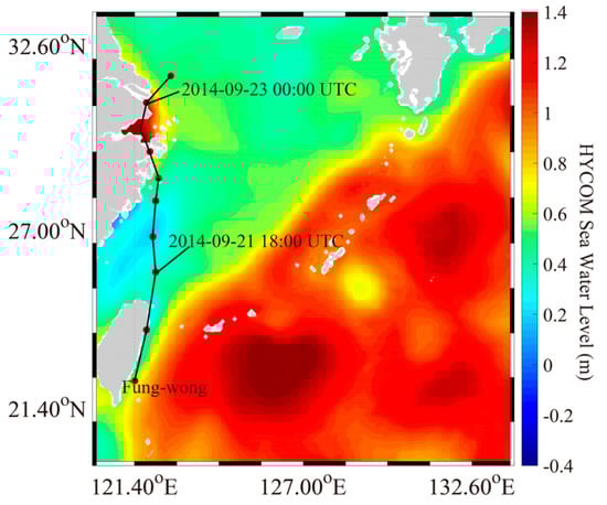 Sea-water-level map from the HYbrid Coordinate Ocean Model (HYCOM) at 12:00 UTC on 22 September 2014, in which the black line is the track of Typhoon Fung-wong.
