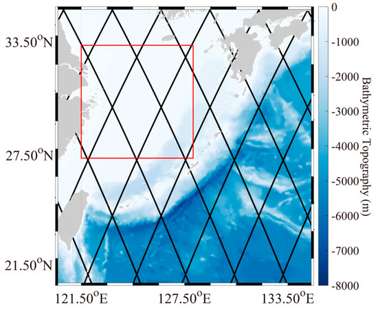 Footprints from the Jason-2 altimeter overlaid on the water-depth map of September 2014, in which the red square encloses the waters around the Zhoushan Islands.
