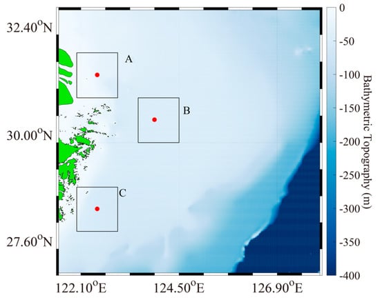Three typical regions around the Zhoushan Islands used to study the statistical analysis of current speed. Region A is located in the Yangtze Estuary and tidal flats. The three red spots represent the three representative specific locations for studying the extreme waves.