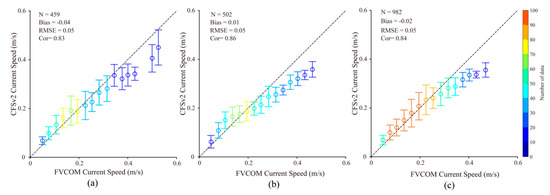 Comparison between current speeds simulated by the FVCOM and the CFSv2 data for a 0.1-m/s bin between 0 and 0.6 m, in which the error bars represent the standard deviations of each bin for the matchups in (a) Region A, (b) Region B, and (c) Region C.