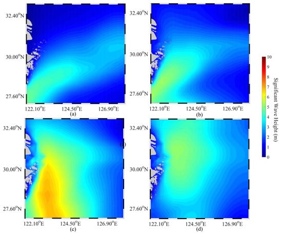 The average SWH maps simulated by the SWAN model when Typhoon Fung-wong passed the Zhoushan Islands on (a) 20 September 2014, (b) 21 September 2014, (c) 23 September 2014, and (d) 23 September 2014.
