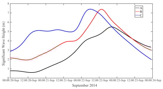 The time series of the simulated SWH at the selected Points A to C shown in Figure 7 during the period from 20 September to 24 September 2014.