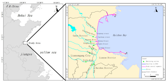 Haizhou Bay, Lianyungang is located in the northeast of Jiangsu province, China, and to the south of Shandong province. It is the westernmost open bay in the south Yellow Sea of China, covering an area of around 820 km2. It ranges from Lanshan Town in Rizhao City, Shandong province in the north (Point A in Figure 1: 35°05′55″ N, 119°21′53″ E), to Gaogong Island in Lianyun District, Lianyungang City, Jiangsu province (Point B in Figure 1: 34°45′25″ N, 119°29′45″ E) in the south. The coastline of the study area is 130.3 km in length. The majority of Haizhou Bay is governed by Lianyungang City, Jiangsu province, and its adjacent administrative districts are Ganyu County and Lianyun District of Lianyungang City. There are nine main rivers in Haizhou Bay (Figure 1). Longwang River flows into Haizhou Bay via Longwang estuary, Xingzhuang River into Haizhou Bay via Xingzhuang estuary, Shangwang River into Haizhou Bay via the barrage of Shangwang River, Qingkou River into Haizhou Bay via the barrage of Qingkou River; the rest five rivers, i.e., Zhuji River, Fanhe River, Xinshu River, Qiangwei River, and Dapu River, converge in Linhong Estuary, and thus all flow into the ocean via Linhong Estuary. Therefore, the nine rivers in the studied waters have five major estuaries. The length and drainage area of main rivers in Haizhou Bay are shown in Table 1.