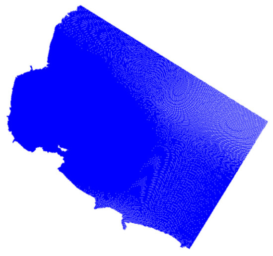Delft3D is a multidimensional (2D, 3D) hydrodynamic (and mass transport) simulation program [37,38,39,40]. It calculates unsteady flow by establishing linear or curvilinear grids suitable for boundary conditions. Based on the Navier Stokes equation, it uses the alternating direction implicit method (ADI) of finite difference method. The governing equations in the corresponding coordinate system are discretized.