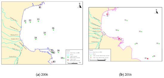 This paper studies the changes in the environmental capacity of Haizhou Bay from 2006 to 2016. Therefore, in the calculation and validation of the model, the relevant data matching the research time is used. When calculating the marine environmental capacity in 2006, the coastline, seabed topography and hydrological data in 2006 were used for numerical simulation. When calculating the marine environmental capacity in 2016, corresponding data of the study area in 2016 were used for numerical simulation.