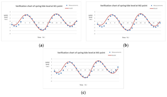 Tide level verification in 2006. (a) Verification chart of spring tide level at Point M1; (b) Verification chart of spring tide level at Point M2; (c) Verification chart of spring tide level at Point M3.