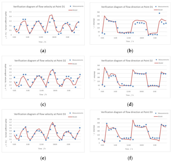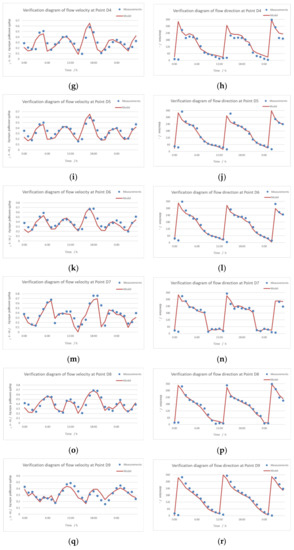 Tide current verification in 2006. (a) Verification diagram of flow velocity at Point D1; (b) Verification diagram of flow direction at Point D1; (c) Verification diagram of flow velocity at Point D2; (d) Verification diagram of flow direction at Point D2; (e) Verification diagram of flow velocity at Point D3; (f) Verification diagram of flow direction at Point D3; (g) Verification diagram of flow velocity at Point D4; (h) Verification diagram of flow direction at Point D4; (i) Verification diagram of flow velocity at Point D5; (j) Verification diagram of flow direction at Point D5; (k) Verification diagram of flow velocity at Point D6; (l) Verification diagram of flow direction at Point D6; (m) Verification diagram of flow velocity at Point D7; (n) Verification diagram of flow direction at Point D7; (o) Verification diagram of flow velocity at Point D8; (p) Verification diagram of flow direction at Point D8; (q) Verification diagram of flow velocity at Point D9; (r) Verification diagram of flow direction at Point D9.