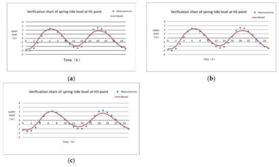Tide level verification in 2016. (a) Verification chart of spring tide level at Point H1; (b) Verification chart of spring tide level at Point H2; (c) Verification chart of spring tide level at Point H3.