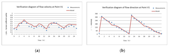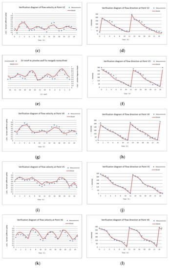 Tide current verification in 2016. (a) Verification diagram of flow velocity at Point V1; (b) Verification diagram of flow direction at Point V1; (c) Verification diagram of flow velocity at Point V2; (d) Verification diagram of flow direction at Point V2; (e) Verification diagram of flow velocity at Point V3; (f) Verification diagram of flow direction at Point V3; (g) Verification diagram of flow velocity at Point V4; (h) Verification diagram of flow direction at Point V4; (i) Verification diagram of flow velocity at Point V5; (j) Verification diagram of flow direction at Point V5; (k) Verification diagram of flow velocity at Point V6; (l) Verification diagram of flow direction at Point V6.