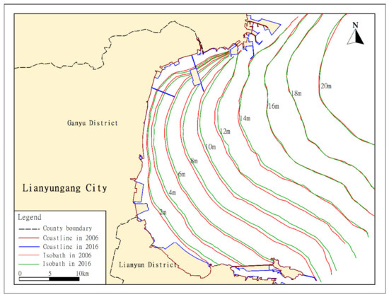 Changes of coastline and isobath in Haizhou Bay from 2006 to 2016.