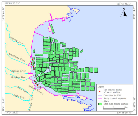 The development activities of the waters outside the estuaries of Haizhou Bay are dominated by open-water aquaculture (Figure 9). The water quality of the culture area should meet the requirements for water quality standard for Class II seawater of the Marine Functional Zoning of Lianyungang City. To ensure that the environmental water quality of the mariculture area in Haizhou Bay is not lower than Class II, we selected the sensitive points closest to the coast of Haizhou Bay and of the five major estuaries as the control points of water quality for the share ratio approach based on mariculture data for 2016. Moreover, COD was selected as the factor for calculating environmental capacity of the estuaries. The COD concentration of the control points should satisfy the requirements for water quality standard for Class II seawater (≤3 mg/L).