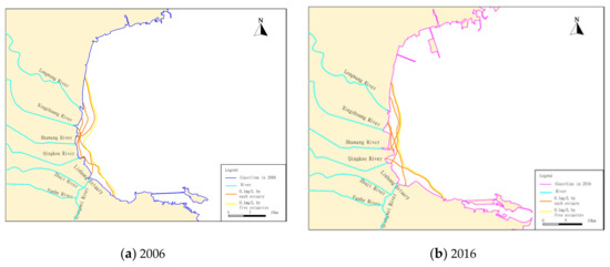 In 2006 and 2016, the runoff and pollutant concentration of the rivers entering the sea changed, and the estuary topography and land boundary also changed due to offshore sea reclamation projects, so the estuary marine environmental capacity in 2016 and 2006 was bound to change as well.