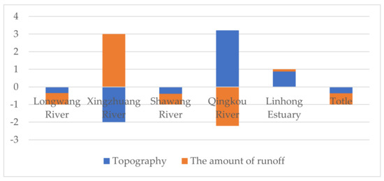 Moreover, increased runoff causes an increase in the environmental capacity of the estuaries, whereas a decrease in runoff reduces their environmental capacity. With the increase of the runoff, the velocity of the water into the sea increases, and the diffusion power is enhanced, so the environmental capacity increases. The reclamation project affects the current velocity and direction in the nearshore estuary area. If reclamation reduces the velocity of the estuary, the diffusion capacity decreases with the decrease of velocity, and the environmental capacity will decrease. Nevertheless, the impact of land reclamation on the environmental capacity of the estuary is fairly complex. It not only involves the land reclamation projects on both sides of the estuary, but also relates to the superimposed effects of multiple land reclamation projects in the estuary on the near-shore hydrodynamic environment. For example, there are large-scale reclamation projects on the north side of Qingkou River and the south side of Linhong Estuary, but the superimposed effects of these projects allowed these two estuaries to form a hydrodynamic pattern that facilitated water exchange with the waters outside the estuaries, thereby increasing the environmental capacity of the estuaries.