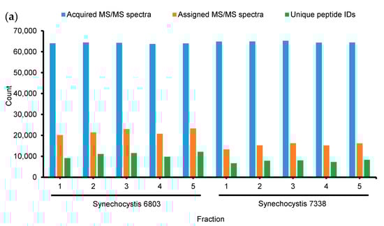 The lists of peptides identified with PeptideProphet and protein groups identified with ProteinProphet at an FDR of ≤0.01 are presented in Tables S1 and S2, respectively. Figure 1 shows the results of proteomic profiling using the 2D-LC system. First, as presented in Figure 1a, the numbers of MS/MS spectra acquired in each run were similar among 10 fractions. Each fraction (MS/MS time ~185-min) resulted in approximately 64,000 acquired MS/MS spectra, equivalent to 320,000 MS/MS spectra per sample. However, the number of assigned MS/MS spectra in Synechocystis 6803 was higher than that of Synechocystis 7338 (21,732 ± 1383 vs. 15,214 ± 1178). In addition, the numbers of unique peptide IDs in Synechocystis 6803 and 7338 were 10,763 ± 1258 and 7658 ± 667, respectively. Thus, the numbers of assigned MS/MS spectra and unique peptide IDs in Synechocystis 6803 were about 1.4-fold higher than those in Synechocystis 7338. It is obvious that, in each strain, the numbers of assigned MS/MS spectra and unique peptide IDs were similar among the five fractions, which indicates the even distribution of peptides following high pH RP fractionation. Furthermore, when using ProteinProphet to identify protein groups in each fraction of two samples, the numbers were similar among fractions (1326, 1468, 1446, 1346, and 1433 for Synechocystis 6803; 1013, 1078, 1090, 1031, and 1174 for Synechocystis 7338). Figure 1b presents the cumulative numbers of identified peptides and protein groups (single hit included) against the number of fractions. The number of peptides increased gradually with the number of fractions for both samples. However, the number of protein groups increased slowly after two fractions as a result of the redundancy of protein groups in the later fractions.