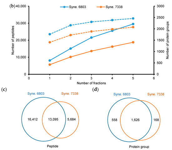 Results of the proteomic profiling of Synechocystis (Syne.) 6803 and 7338 using the 2D-liquid chromatography (LC) system. (a) Distribution of the number of acquired tandem mass spectrometry (MS/MS) spectra, assigned MS/MS spectra, and unique peptide IDs across five fractions in 2D separation. Samples were proteome digests of Synechocystis 6803 and 7338. (b) The cumulative numbers of identified peptides (solid line) and protein groups (single hit included) (dash line) by the number of fractions. (c,d) Venn diagrams that present the numbers of peptides identified with PeptideProphet and protein groups identified with ProteinProphet.