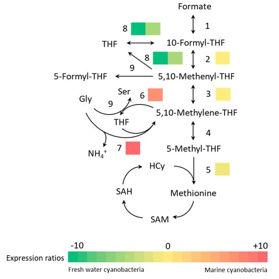 C1 metabolism showed the protein expression using different pathways in one metabolism process. C1 metabolism plays a major role in the supply and reproduction of methyl groups. It is essential to produce amino acids such as methionine, glycine, and serine, as well as purine and thymidylate [85]. As shown in Figure 3, Synechocystis 6803 converted 5,10-methylene-tetrahydrofolate (5,10-methylene-THF) to 5,10-methenyl-THF through methenyltetrahydrofolate cyclohydrolase, and 5,10-methenyl-THF was converted to 10-formyl-THF by methylenetetrahydrofolate dehydrogenase, while 10-formyl-THF was converted to formate by reproducing THF. In comparison, aminomethyltransferase (GDC) and thymidylate synthase in Synechocystis 7338 are known to convert 5,10-methylene-THF into glycine. GDC in Synechocystis 6803 has been reported as a non-essential gene since the GDC-deleted mutant did not hinder its growth using C1 metabolism without GDC [86]. GDC is located in the mitochondria of eukaryotic cells and is known to be involved in photorespiration and nitrate assimilation [85,87]. In plants, GDC also acts as a feedback signal that regulates carbon flow in photosynthesis and photorespiration while being regulated by glycine levels [88,89]. Moreover, GDC deficient plants are known to cause an over-reduction and over-energizing of chloroplasts due to their dysregulation of photorespiration [90]. In marine organisms, glycine is known to be an amino acid-based osmolyte that is produced to control intracellular osmotic pressure [91]. Therefore, Synechocystis 7338 seems to use osmolyte glycine as a substrate for C1 metabolism to regulate carbon flow, unlike Synechocystis 6803.