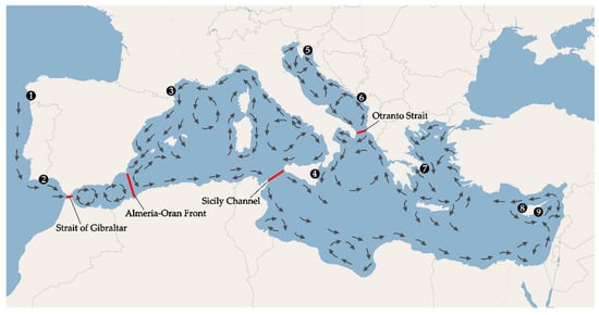 Map of the studied area, with sampling sites (black dots), main oceanographic barriers (red lines) and circulation of the main currents in the Mediterranean Sea (arrows). 1—Spain, 2—Portugal, 3—France, 4—Sicily, 5—Croatia, 6—Montenegro, 7—Greece, 8—Cyprus W (west), 9—Cyprus E (east).