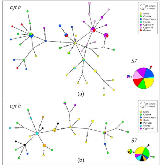 In G. cruentatus, cyt b haplotype network reconstruction did not reveal any well-defined spatial structure (Figure 3b). The network consisted mostly of unique haplotypes, very diverse for each locality (Figure S1b). Three haplotypes were shared between two or three distant populations (Spain/Sicily, Sicily/Croatia/Cyprus, Cyprus/Croatia). The network displayed two highly variable haplogroups separated by six mutational steps. Interestingly, there was a particular geographic pattern: while haplotypes from the central Mediterranean populations (Croatia, Sicily and Montenegro) were in both haplogroups, the haplotypes from the westernmost populations (Portugal, Spain and France) were placed only in one haplogroup, and haplotypes from the easternmost population, Cyprus, occurred only in the other haplogroup. On the contrary, there was nearly no polymorphism in S7. The network was formed by one dominant haplotype which included 69 alleles (out of 78) and was shared among all populations, one less frequent shared haplotype, which included only 7 alleles, and two unique ones. All haplotypes were very similar (Figure 3b). The remaining analyses were performed only on the cyt b dataset due to the low polymorphism in S7.