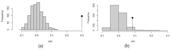 Histograms of the Mantel test assessing the relationship between genetic and geographic distance for Gobius geniporus (a) and G. cruentatus (b).