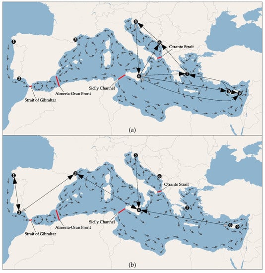 Circulation of water in the studied area, and especially in the Mediterranean Sea, is very complex. The main currents and gyres are depicted in Figure 1. Within the studied region, multiple biogeographical barriers have been identified, of which the Almeria-Oran front, the Strait of Sicily and the Otranto Strait (see Figure 1) are considered to be the major ones influencing genetic diversity of various marine organisms [1,13]. However, dissimilar influence of biogeographic barriers has been found even for the closely related taxa with the same biology and ecology [31,32,33,34].