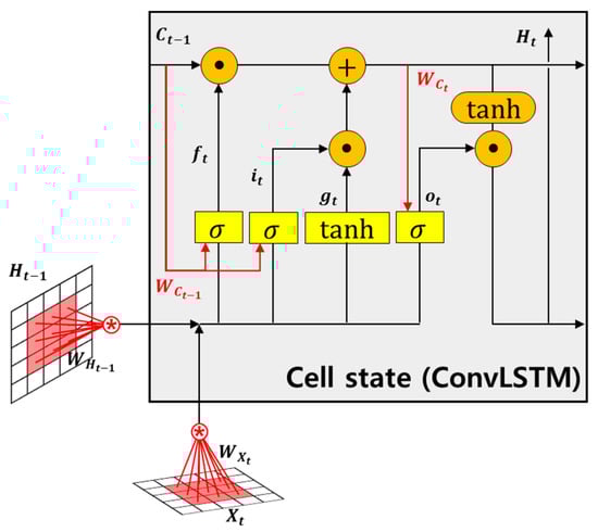 To consider spatial causality in learning, 2D data (image) should be used as input. As described previously, 2D data have a feature that even when the size is increased only slightly, the dimension of the data is significantly increased during training, such as calculating the weight of models. Therefore, a convolutional neural network (CNN) [11], one of the deep learning methods that is used to consider the characteristics of images, can be employed in the LSTM learning model. The most common technique involves a long-term recurrent convolutional (LRCN) network [10], where each 2D feature vector is first extracted by the CNN and used as an input of the LSTM. The difference between the LSTM and the LRCN networks is that the latter (LRCN) passes the input through a convolutional layer. Then, the input data can be an image, that is, 2D data. However, when using 2D data from multiple channels as input data, a 3D tensor is used as input, and feature vectors extracted through the CNN also need to undergo the same process inside as the LSTM. Therefore, it is not suitable for training long-range data, such as ocean weather. However, the ConvLSTM [12] uses an entirely different approach. By performing the LSTM internal operation itself as a convolutional operation, the amount of computation can be dramatically reduced. Figure 3 shows the internal cell state of the ConvLSTM.