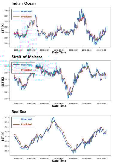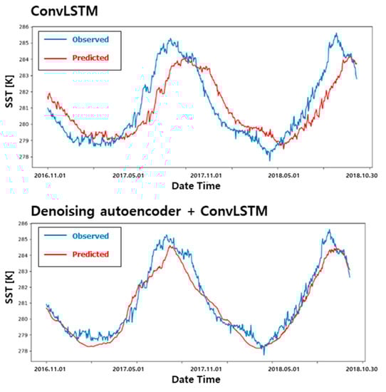 To analyze the effect of using the denoising AutoEncoder, SST of South Korea’s Yellow Sea was selected as a prediction target, as in the previous example. A total of 8 years of data were used, and a training set of 6 years and a test set of 2 years were used. The data were only used for this section and are different from the data mentioned in Section 4.1. Figure 9 shows the result of SST prediction. The upper graph is the prediction result using only the ConvLSTM, and the lower graph is the prediction result using the denoising AutoEncoder as the input of the ConvLSTM model. In the test case, models predicting a month (30 days) from the present were trained and compared whether the delayed problem is clearly visible or not. The result shows the last 2 years (from November 2016 to October 2018) of the predicted range, which was not used for training. The two data used in Figure 8 and Figure 9 are the same. However, in Figure 9, the graph was drawn using 2 years of data to show the effect of the denoising AutoEncoder clearly.