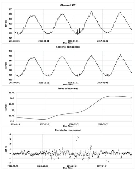 Figure 4 shows the delayed prediction results of SST. We trained a model to predict SST after 5 days using 60 days of data and applied it to three different ocean areas. For training of the prediction model, data collected from the European Center for Medium-Range Weather Forecasts (ECMWF) was used, and a total of eight years of data was used for training. Among them, the initial six years were used for learning, and two years were used as a test set. We performed the training using conventional LSTM based on the data for a point in the region included in Figure 4. As shown in Figure 4, it can be seen that the delayed prediction problem occurred clearly in all graphs. The same problem can also be found in other studies [4,14]. The graphs show that the actual result and the predicted patterns are very similar, although there is a slight difference. Further, it seems that the predicted result has a phase shift with respect to the origin. The delay prediction problem is mostly caused by not being able to understand the data patterns properly. Using all of the predictors required for prediction as input can also be a way to solve the delayed prediction problem. However, as input is limited to eight parameters of ocean weather, we have to find another way to remove noise to solve this problem. There are two ways to solve this. The first is to gather sufficient training data to comprehend the data pattern. If the data for ocean weather can be obtained infinitely, it is possible to make a satisfactory model through a general DFN or LSTM. However, the data for ocean weather has limitations because it is based on the data that can be accessed from the weather centers. Second is to remove the noise from the data so that the pattern of the data is sufficiently revealed. The time-series data are generally composed of the trend component, seasonal component, and remainder component. The trend component represents the trend of data fluctuation, the seasonal component is the repeating pattern of data, and the remainder component usually refers to noise. These data can be decomposed into the three components described above using the seasonal and trend decomposition using loess (STL) decomposition method [15]. Figure 5 shows the decomposition of SST from 2014 to 2017 into the three components described previously. In the remainder component, the ocean weather has a large amount of noise. This noise hinders the learning of seasonal and trend components. Therefore, this study proposes a method to effectively remove the noise. When using the STL decomposition method, two main parameters are used. Two are the trend-cycle window and the seasonal window. In particular, as there is no default value for the seasonal window, the results of the STL decomposition method can be different depending on how much the seasonal window is set. In this study, one year was divided into four seasons, and a seasonal window was set considering this.