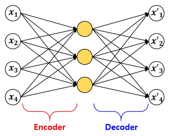 AutoEncoder is a type of ANN used to train efficient data codings in an unsupervised manner [17]. AutoEncoder simply copies input to output, as shown in Figure 6. The process seems simple, but it can have a variety of effects on data by constraining the network in different ways. Among them, Figure 6 shows a type of denoising AutoEncoder that reduces the number of neurons in the hidden layer to be smaller than that of the input layer, encodes the data to take only those characteristics, and then decodes it to remove noise.