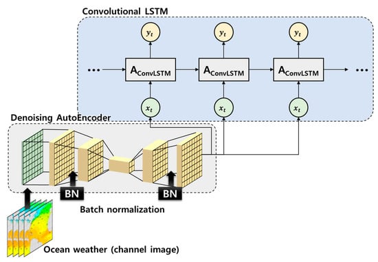 In the case of ocean weather, one option is available-that is, to gather data provided by weather centers. In this situation, measurement and estimation errors exist depending on the method used by weather centers in acquiring data. Therefore, for training efficiency, noise should be removed. To remove noise from the ocean weather, weather centers have utilized various methods, such as a principal component analysis (PCA)-based noise filter [16] for a long time. However, noise still exists in the ocean weather. The residual component is one of the essential factors when predicting regionally correct values. In addition, due to the nature of ocean weather, this residual component always exists. However, when training a data-driven model, this residual component prevents the proper understanding of the remaining components (seasonal component and trend component). Moreover, it causes a significant reduction in training efficiency. Of course, it is best to develop a learning model that can acquire very long periods of data and predict residual components. However, there are limitations in gathering data infinitely. Therefore, we should reduce the noise of the data as one option. Analyzing all the data and removing noise is practically impossible. In this study, the ocean weather is converted into a 2D image and used to train the ConvLSTM model. Therefore, an AutoEncoder that can extract important features and remove noise from 2D data was used.