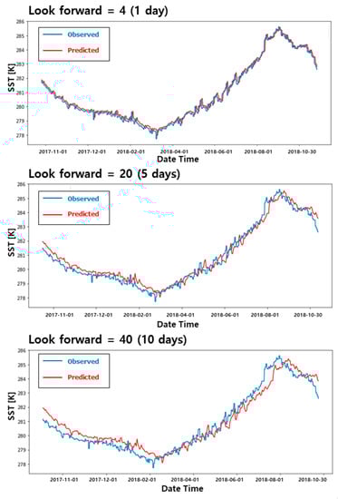 Prior to comparing the two models, to determine whether the delay prediction result occurs even when training SST, the look forward value was changed under the same conditions by using a single channel of SST as input data, and the accuracy was compared. Figure 8 shows the results of SST predictions for the Yellow Sea in South Korea for approximately a year in 2018. It shows the difference in prediction results according to the look forward value. When the look forward value was set to 4, 1 day later, a little difference was found between the observed value and the predicted value. However, evidently, the predicted value is similar to the shape when the observed value graph is slightly shifted to the right. When the look forward value is increased to 20 (5 days) and 40 (10 days), the delay prediction result can be clearly confirmed. Notably, the look forward value increases, and the delay prediction problem of the prediction result becomes more pronounced. This occurs because, as explained in Section 2.3, the learning model does not accurately grasp the data pattern because of the noise. As the look forward value increases, the farther the value to be predicted is from the current time when the prediction is made so that the current value can be scaled as it is and inferred as a prediction result. To address this problem, the noise should be removed by adding a denoising AutoEncoder to the ConvLSTM model.