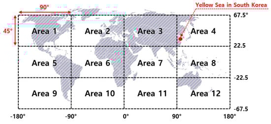 The conventional models of deep learning, such as DFN and LSTM, use data for specific locations to learn. Therefore, it is challenging to compare the ConvLSTM to DFN or LSTM directly. A large number of learning models are required to target worldwide data. Although the total number of models differs depending on how the resolution of the training model is set, 64,800 (= 180 × 360) models are needed worldwide to build a learning model for the ocean weather with resolutions of 1 degree in longitude and latitude. The recent increase in computing power has accelerated learning speed, but it takes considerable time to train 64,800 models. Therefore, in this study, the world was divided into 12 areas, and the proposed learning model was applied. Figure 11 shows the 12 areas used in this study. Dividing the latitude from −67.5° to 67.5° into three equal parts and the longitude from −180° to 180° into four equal parts divided the world into 12 equal pieces.