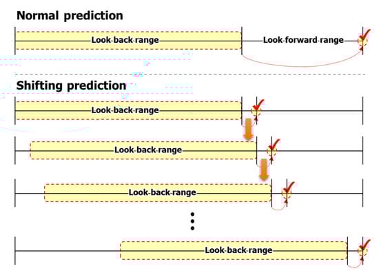 The shifting prediction is a method of predicting a specific point and using the predicted data as an input to predict the following continuously. For example, if the learning model is trained as a model that predicts one step forward, it cannot predict after four steps. In this case, the result of predicting the first step forward can be used as input again to predict the second step forward. By repeating this process, we can predict 4 steps forward and even can predict 100 steps forward. Figure 12 shows a comparison between normal prediction and shifting prediction. In the process of using deep learning models, we confirmed various studies on shifting prediction. Rasp et al. [21] performed a similar approach and named it “iterative prediction”. If the satellite communication is lost, we cannot get nowcasting information. However, we can predict any days in the future from past data by generating our own prediction model. In addition, using shifting forecasting allows for predicting the far future as well; thus, we can make a long-term plan. In this study, the difference in accuracy between the two methods was analyzed.