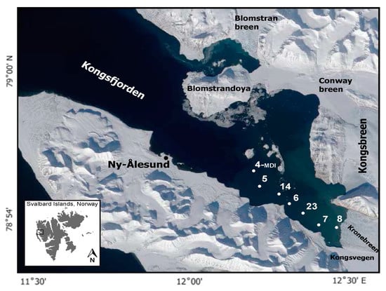 - Hop, H.; Wiencke, C. The Ecosystem of Kongsfjorden, Svalbard. In The Ecosystem of Kongsfjorden, Svalbard; Hop, H., Wiencke, C., Eds.; Advances in Polar Ecology 2; Springer Nature: Cham, Switzerland, 2019; Chapter 1; pp. 1–20. [Google Scholar] [CrossRef]