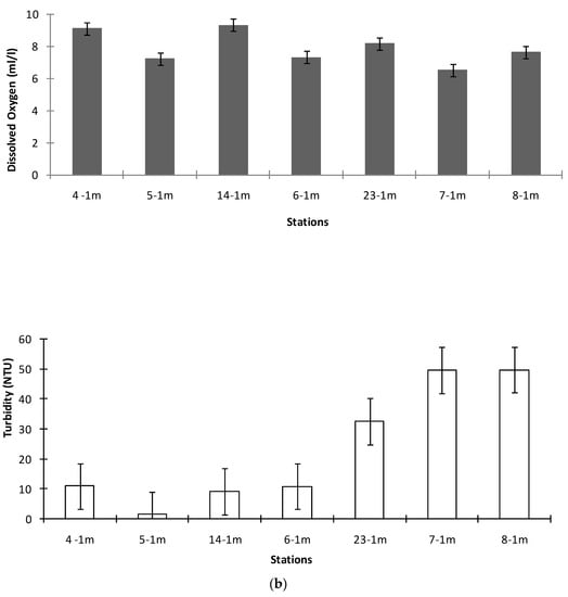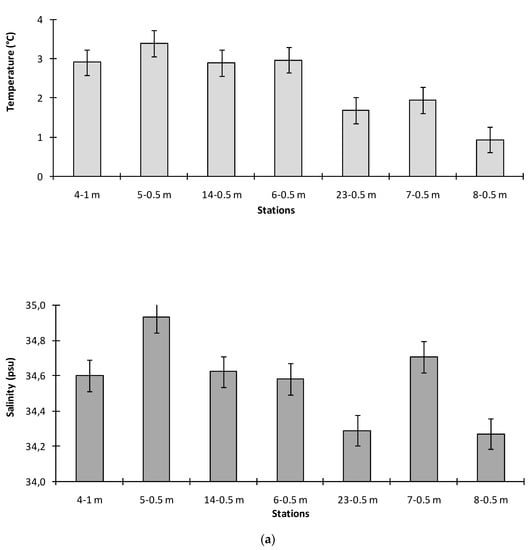 The distribution patterns followed by the physical and chemical variables measured during this survey are shown in Figure 2a,b. Temperature values were in the range of 0.93–3.38 °C (at st.8 and st.5, respectively), and salinity of 34.27–34.94 psu (at st. 8 and.4–75 m, respectively) (Figure 2a). Dissolved oxygen ranged from 6.53 to 9.36 mL/L (at st. 7 and 4–5m, respectively), while turbidity was comprised between 1.48 and 49.72 (at st.5 and st.8, respectively) (Figure 2b). At station 4, temperature and dissolved oxygen values decreased slightly along the water column; conversely, salinity increased with depth. More variable, although not statistically significant, were the vertical patterns of turbidity (data not shown in Figure 2). Temperature and salinity values decreased from st. 4 to 8 (glacier), while an opposite trend was observed for turbidity and inorganic compounds.